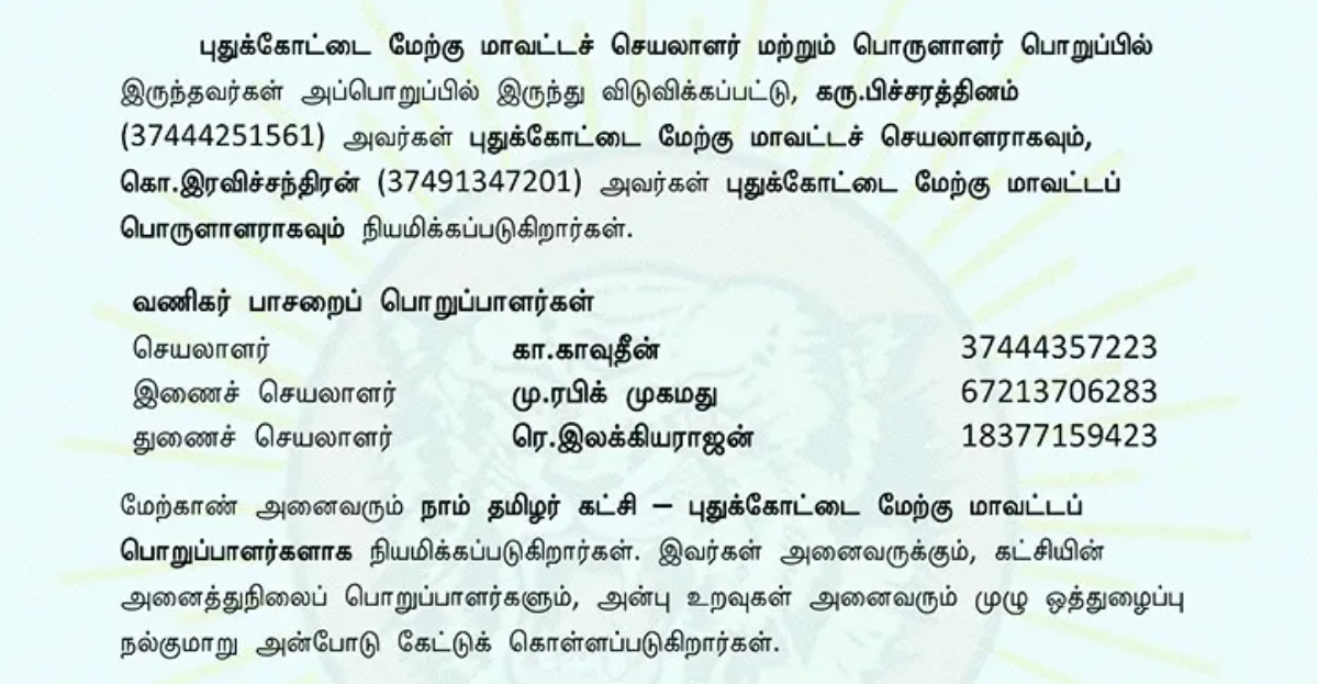 புதுக்கோட்டை மேற்கு மாவட்டப் பொறுப்பாளர்கள் நியமனம்