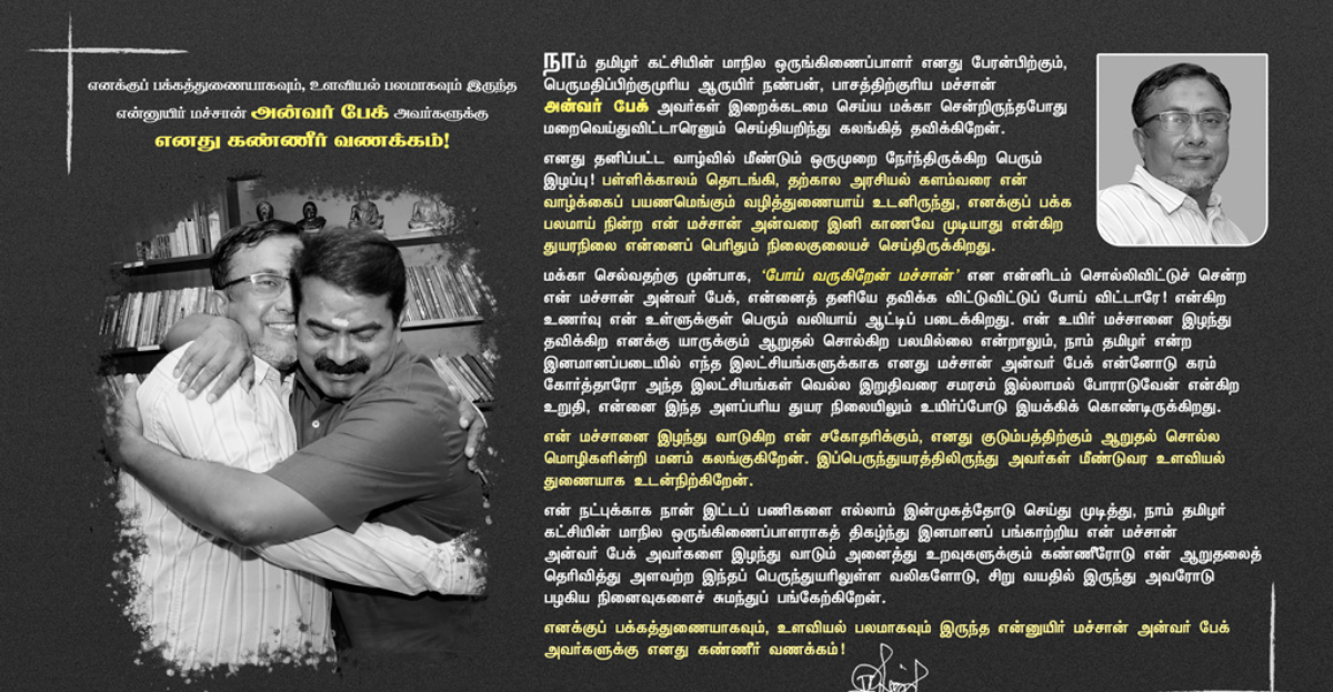 நாம் தமிழர் கட்சியின் மாநில ஒருங்கிணைப்பாளர் எனது பேரன்பிற்கும், பெருமதிப்பிற்குமுரிய ஆருயிர் நண்பன், பாசத்திற்குரிய மச்சான் அன்வர் பேக் அவர்கள் இறைக்கடமை செய்ய மக்கா சென்றிருந்தபோது மறைவெய்துவ ...