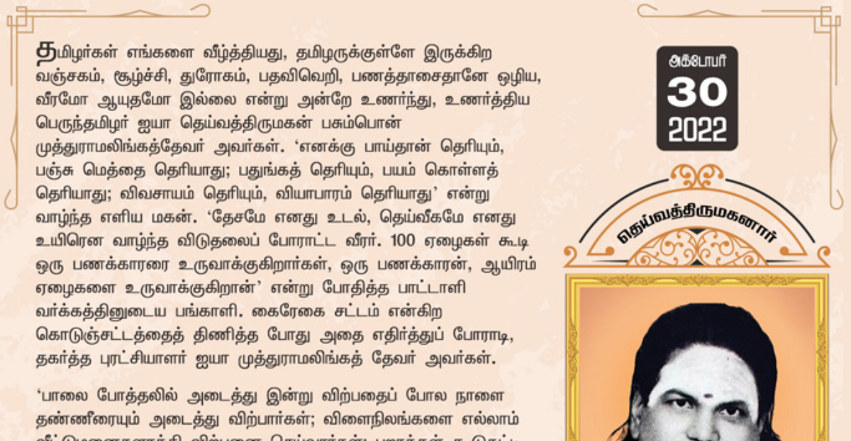 தமிழர்கள் எங்களை வீழ்த்தியது, தமிழருக்குள்ளே இருக்கிற வஞ்சகம், சூழ்ச்சி, துரோகம், பதவிவெறி, பணத்தாசைதானே ஒழிய, வீரமோ -ஆயுதமோ இல்லை என்று அன்றே உணர்ந்து, உணர்த்திய பெருந்தமிழர் ஐயா தெய்வத்திருமக ...