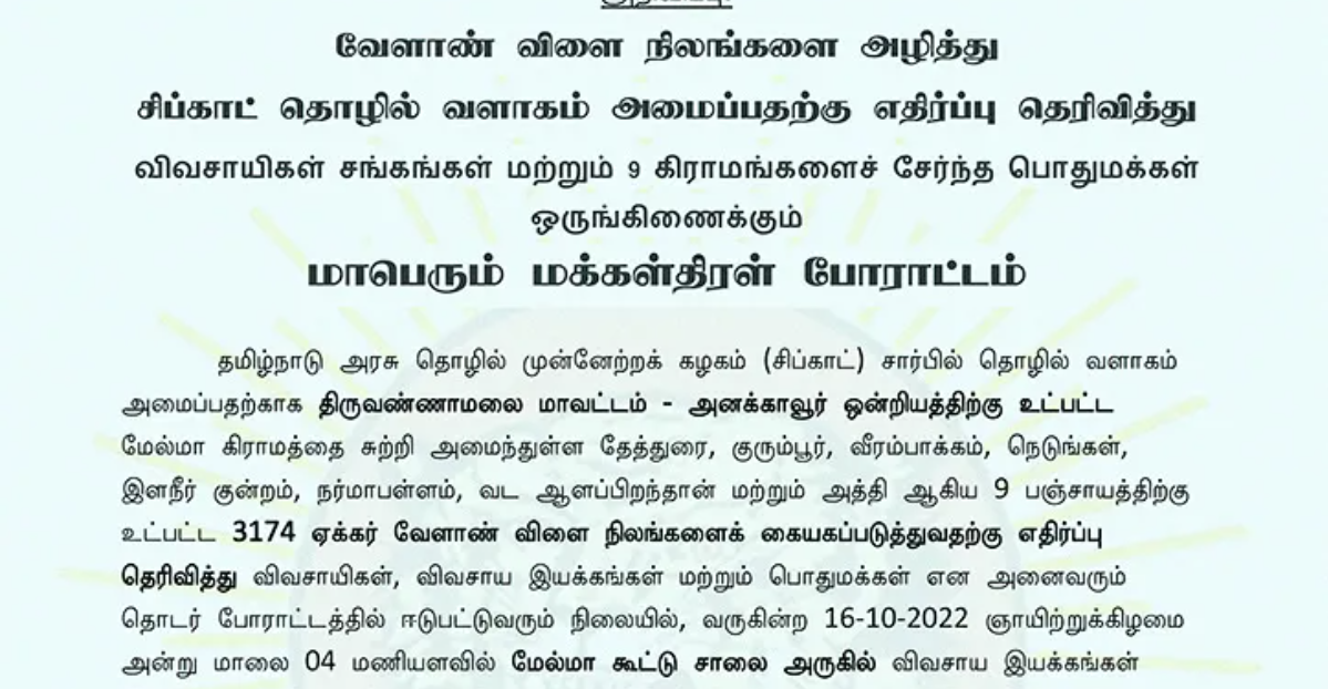 அறிவிப்பு: வேளாண் விளை நிலங்களை அழித்து, சிப்காட் தொழில் வளாகம் அமைப்பதற்கு எதிர்ப்பு தெரிவித்து விவசாயிகள் சங்கங்கள் மற்றும் 9 கிராமங்களைச் சேர்ந்த பொதுமக்கள் ஒருங்கிணைக்கும்