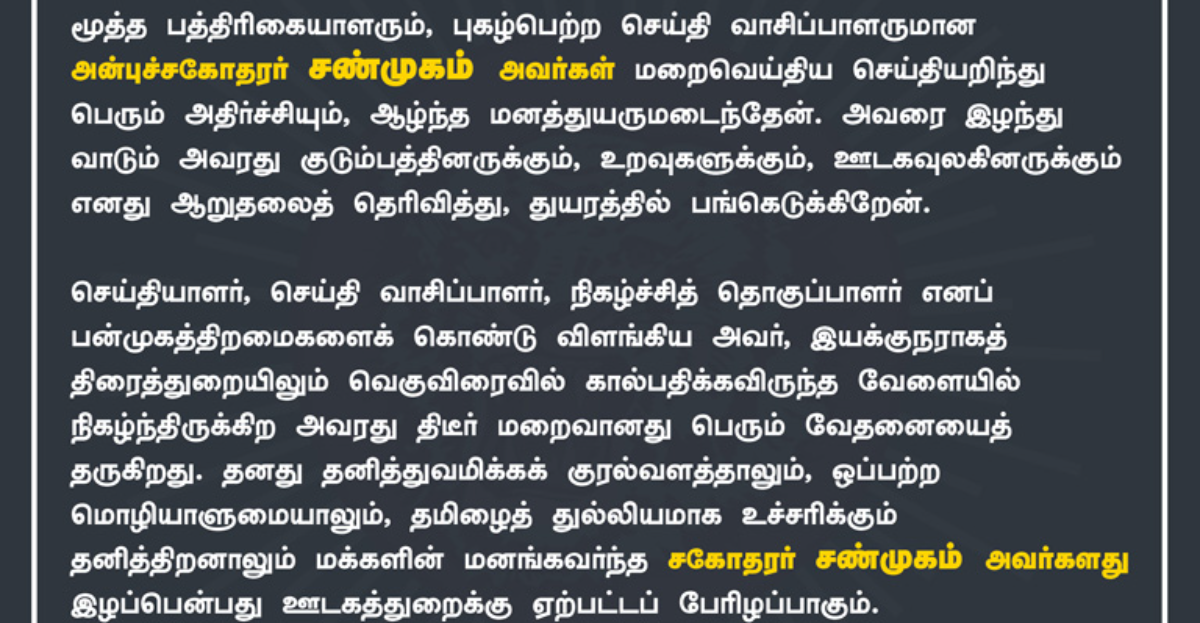 மூத்த பத்திரிகையாளரும், புகழ்பெற்ற செய்திவாசிப்பாளருமான அன்புச்சகோதரர் சண்முகம் அவர்கள் ...